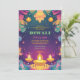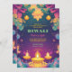The front of the invitation features a soft pastel background with a harmonious blend of gentle colours, creating a serene and cheerful atmosphere. At the bottom, three delicately illustrated Diya lamps shine with subtle, colourful accents, adding a touch of tradition. The event details are elegantly scripted, complementing the pastel palette. The back of the card continues the pastel theme, offering space for customisable text and Diwali wishes. The overall design is light, vibrant, and perfect for a warm and inviting Diwali celebration.