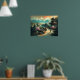 Add some oriental charm to your home with this stunning Asian pagoda print. This print features a detailed illustration of a traditional pagoda-style building surrounded by lush greenery and a serene water stream. The vibrant colours and whimsical clouds create a captivating contrast that will catch anyone’s eye.