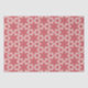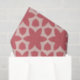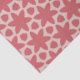 The pattern features a symmetrical, repeating design with a bold, floral motif. It consists of shapes in two main colours: a deep coral red and a pale pink background. The central element is a large, stylised flower with six petals in coral red. Surrounding this flower are additional geometric shapes, including petal-like and polygonal forms, creating a balanced and harmonious design. The pale pink background provides a soft contrast, making the coral red shapes stand out prominently.