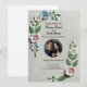 • This wedding invitation features soft pastel florals with a modern and elegant layout, perfect for any romantic celebration. The design includes a special section for a removable photo of the couple, creating a personalised keepsake. Its minimalist yet charming aesthetic suits a variety of wedding themes, from garden to contemporary.