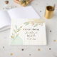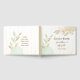 Wedding guest book depicts simple watercolor flowers in pastel shades of gold, blue and pink on a rustic white wood background. Back inspirational quote, "GOD has led Two lives to take One path." Quote can be customised to your choice.