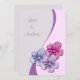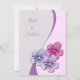 This is a pretty springtime or summertime wedding invitation. Pink, lavender and pastel blue flowers with jewel like centres decorate the lower right of the invitation, while a modern twist is given with the grey and light pink background colours separated by a violet curved border. The bride and groom first names appear in grey text on the upper left. The back of the invitation is matching grey, and is easily customised with your wedding text. *Special thanks to Lorene at Digital Diva for use of her artwork in this design.*