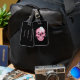 Pastel goth luggage tag with a funny pink skull and ghosts coming through its eye sockets.