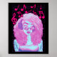 Big haired music lover girl vaporwave aesthetic graphic in shades of pink, purple, and blue.