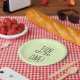 Simple and sweet first birthday party design has a pastel lime green background. There is text in large dark grey font that says Fun to be ONE! This simple pastel green design coordinates perfectly with our Pastel Polka Dots Fun To Be One First Birthday Party invitations, paper plates and thank you cards!