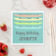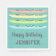 Make your party a splash with these personalised party napkins. They feature illustrations of kayaks in pretty pastel colours of peachy coral, pale yellow, lime green and aqua blue set against a teal or turquoise blue background. These kayaking themed party supplies are ready to be personalised with your own greeting and name in charcoal grey coloured lettering.