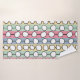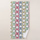 This towel set has a green washcloth, a blue hand towel, and a bath towel with a mid-century modern design of white “deformed” circles connected with black lines on a field of pale green, pale pink, pale blue, and pale yellow strips. If you like the design but prefer different colours, message me.