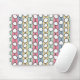 This mouse pad has a mid-century modern design of white “deformed” circles connected with black lines on a field of pale green, pale pink, pale blue, and pale yellow strips. If you like the design but prefer different colours, message me.