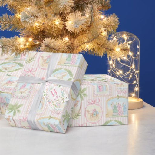 This Christmas card features a nativity image of baby Jesus sleeping in a manger with Mary and Joseph in the center surrounded by a the wise men and two angels. The top has a greeting that says "Hark the Harold Angels Sing." You can personalize with names and a year.