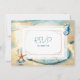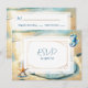 Elegant romantic oceanic coastal themed wedding RSVP cards. Soft pastel brown sand pale blue water with a sand dollar on the beach. Watercolor seahorse and starfish.