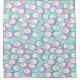 This shower curtain has a pattern of scattered ovals in turquoise and purple with white ovals and circles with lines inside.