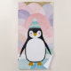 This charming illustration features a whimsical penguin centered against a backdrop of soft, overlapping semicircular hills. The palette is a gentle dreamscape of pastel pinks, lavenders, and mint greens, executed with a delicate watercolor texture that suggests a snowy, magical landscape. The penguin itself wears a cozy, patterned teal beanie, adding a touch of personality and warmth to the cool setting. Subtle gold leaf accents in the sky and on a floating celestial sphere provide a hint of fairy-tale elegance, blending minimalist character design with folk-art inspired patterns.