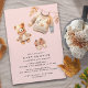 Cute autumn baby shower invitations with watercolor illustrations of a teddy bear, fall leaves, and cosy baby clothes. Delicate baby pink colour is ideal for a shower celebrating a baby girl.
