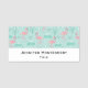 Name tag with a whimsical pattern. Pastel pink flamingos on a light green background. Green lily pads and lotus flowers. Cute tropical vibe.