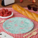 Paper plates with a whimsical pattern. Pastel pink flamingos on a light green background. Green lily pads and lotus flowers. Cute tropical vibe.