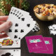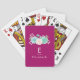 Playing cards with a custom name and monogram initial on a magenta background. A pastel watercolor flower bouquet at the top. The flowers, leaves and sprigs are pastel pink and green. Created with watercolor paint and digitised. Fresh and summery.
