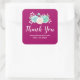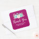 Custom thank you business stickers with your website and phone number. Designed with a magenta background. A pastel colour watercolor flower bouquet at the top. The flowers, leaves and sprigs are pastel pink and green. Created with watercolor paint and digitised. Thank You is written in a cute trendy font. Fresh and summery.