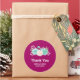 Wedding thank you stickers with a magenta background. A pastel colour watercolor flower bouquet at the top. The flowers, leaves and sprigs are pastel pink and green.