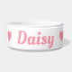 This ceramic dog bowl has two pastel blush pink hearts and can be personalised with your dog's name. Choose any font style and colour that you prefer instead of the pink shown here. You can move the hearts around and adjust their size also to make this dog dish just right for your dog. Makes a unique and fun gift for any dog parent!