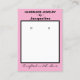 Handmade Jewelry by Name in black typography against pastel pink background. Handcrafted with Love written in black script (keep or insert short tagline, or delete to leave area blank). Two Small Circles against white and black framed background. NOTE: Circles are not pre-cut, you will need to use a Small hole punch to make clean cut holes, to then place your Earrings in. Backside: Insert telephone number, email address, website, social media handle, delete lines not needed. Insert Your Website Business QR Code on left-hand side for customers to Shop 24/7, and Pinterest (or other) social media link site QR Codes on right-hand side (leave Icons, or insert other social media icons, or delete). Click Personalize to move Website QR to center, if deleting Social Media icons. Original Design by TamiraZDesigns.