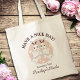 The product design features bunny twins with an off-white ribbon and polka dots. This adorable animal cartoon makes a cute and unique tote bag with personalised text for library book, preschool, school, Easter, and more!