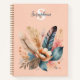An elegant notebook with a nature-themed motif of feathers, leaves and an apricot-coloured flower, on a peachy pink background. The pretty notebook can be personalised with your initial and name as a stylish monogram.