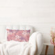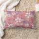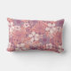 This rectangular throw pillow has flowers and leaves in pastel shades of pink and purple on a pink background.