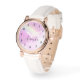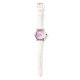 A watch with a beautiful background. A pink pastel sky with fluffy clouds and a lemon coloured rainbow. Magical and whimsical design.