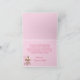 This sweet thank you note features a cute teddy bear sitting on the floor with a gingham check bowtie on his neck. Beside her is an outfit, a little pair of shoes, some ABC blocks and a wrapped gift. A pale pink and white polka dot pattern is in the background. Inside the card is a message thanking your guests and at the bottom is an old fashioned stroller. The message inside is fully customizable, so you can say whatever you like. The back side of the card is pink and has an umbrella in the center. This thank you note coordinates with a complete collection of pink teddy bear items so be sure to browse through the collection.