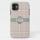 Pretty iPhone 5 Case-Mate Case done in a pastel pink, mint green, and yellow plaid pattern. Graphics of a green band, across the middle, is decorated with a pink and silver tone button, with a one letter green monogram. Personalise the letter for yourself or as a great gift idea. Stylish way to protect your electronic device.