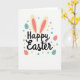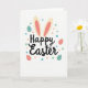 This card features the words “Happy Easter” centered in smooth black lettering, giving the design a gentle, affectionate tone like a note shared between close friends. Just above the text, two tall bunny ears in soft cream with blush-pink inner details rise up, as if a shy little 🐰 is leaning in. The background is white, keeping everything airy and focused on the central message. Around the greeting, small confetti-like dots in teal, mint, and soft coral drift across the space, adding a light, celebratory flutter 🌷. Mixed in are several egg-shaped decorations in muted coral and teal, arranged loosely around the wording so the layout feels balanced and friendly. Each egg is decorated with neat horizontal rows of tiny white dots, adding texture without crowding the center. The ears sit directly above the black “Happy Easter” text, while the teal and coral eggs and scattered dots frame the message on the white background.