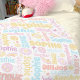 Cute preppy inspired graphic personalised name blanket. This muted soft aqua blue, pink, coral, yellow and dusky pink text typographical blanket can also be customised with your own short name, currently reads Sophie. Other names and colours available or contact me for name requests. This original graphic line art featuring up beat smiling faces, butterflies, flowers, rainbow stripes and stars and is designed by Sarah Trett for exclusively for www.mylittleeden.com