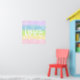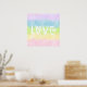 The simple hand-written lettering of “LOVE” with a heart shape and an arrow on the pastel rainbow.