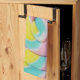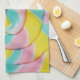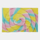 A kitchen towel with a yummy photo. A macro photo of a lollipop. Blue pink and yellow pastel colours in a spiral pattern.