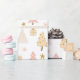 A whimsical Scandinavian holiday pattern featuring Christmas trees, wrapped presents and stars in pastel beige and pink on a white background.