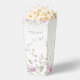 These tall, rectangular boxes are adorned with a delicate wild floral pattern in soft colours, adding an elegant and romantic touch to the wedding favours. The design features small blooms and foliage in pastel shades, and the boxes are personalised with the couple's name and the date. These favour boxes are perfect for presenting small gifts to guests, enhancing the visual appeal of the wedding decor with their thematic design.
