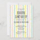 Personalise these gender neutral shower invitations featuring yellow, lavender, pink, blue and white stripes and yellow confetti dots. MATCHING items in our store.
