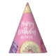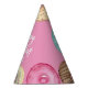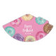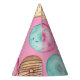 Finish your little one's birthday party decor with these cute dessert themed party hats, featuring "Happy Birthday [Name]" in white lettering, surrounded by watercolor doughnut illustrations in pink, purple, and aqua on a pink background.