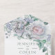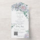 AVAILABLE WTH OR WITHOUT A QR CODE T SCAN IN THE RSVP AREA. This design has beautiful white floral blooms with periwinkle buds, surrounded by soft greenery. The floral design is placed on a white background. Add a QR code to your invitation so that gusts can quickly access your wedding Website for details, directions, menu options, and more, or add your gift registry Web URL. Personalised All-In-One invitations are a unique combination of both a beautifully printed custom invitation with an easy to tear off perforated RSVP postcard. And they are so easy to use! You simply fold, then seal the back flap with the three included clear stickers, and mail. And when your guests receive your custom invite, they just tear the perforated RSVP Card off and drop it back in the mail to you!
