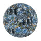 Discover the artistry in the patchwork pattern, where different fabrics come together with blue flowers in harmony.