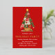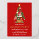 Elegant foil holiday party invitations featuring a festive patchwork Christmas tree adorned with ornaments and surrounded by wrapped presents. Personalise the magical Christmas tree party invitations with your party details in gold foil and green lettering. The invite reverses to a white background