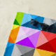 Many triangles in yellow, orange, red, pink, blue, green colours creating fun modern geometric pattern.