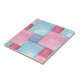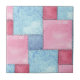 An attractive tile, for use as a trivet, with a pattern of patchwork in pink and blue denim colours, from a handpainted watercolour design by Judy Adamson.