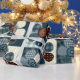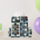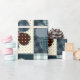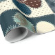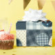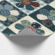 Cute country themed gift wrap features a 4-panel graphic of patchwork button flowers in shades of blue with complementary colours.