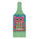 Multi-coloured, folk art style cute polka dot patchwork owl stood on a flowering tree branch with an ornate background and green polka dots.