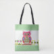 Multi-coloured, cute polka dot patchwork owl stood on a flowering tree branch with green polka dot borders.