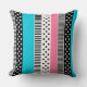 Patchwork made of multi-coloured strips of fabric in pink, blue and black and white.