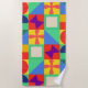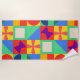This beach towel has a Bauhaus design of squares with odd shapes inside, repeated across the design.