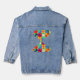 This denim jacket has a Bauhaus design of squares with odd shapes inside, repeated across the design.