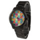 This women's watch has a Bauhaus design of squares with odd shapes inside, repeated across the design.
